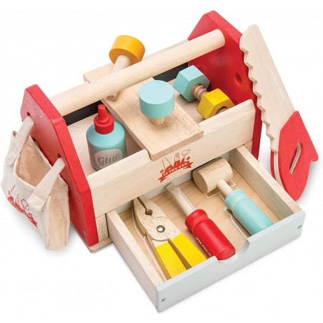 Ein wunderbares Spielzeug für die ersten Jahre, komplett mit 11 Zubehörteilen, darunter: eine Stofftasche, eine Zange, ein Schraubendreher, ein Holzbrett mit zwei Löchern, zwei Nägel, ein Bolzen, eine Schraube, Holzleim und ein Hammer.