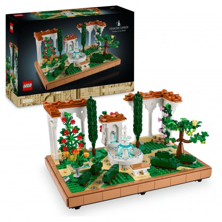- What’s in the box – The LEGO® Fountain Garden features a tiered fountain, lavabo, 2 cypress trees, flowering grapevines, 4 pergolas and tiled pathways, plus luna moth, bird and frog figures